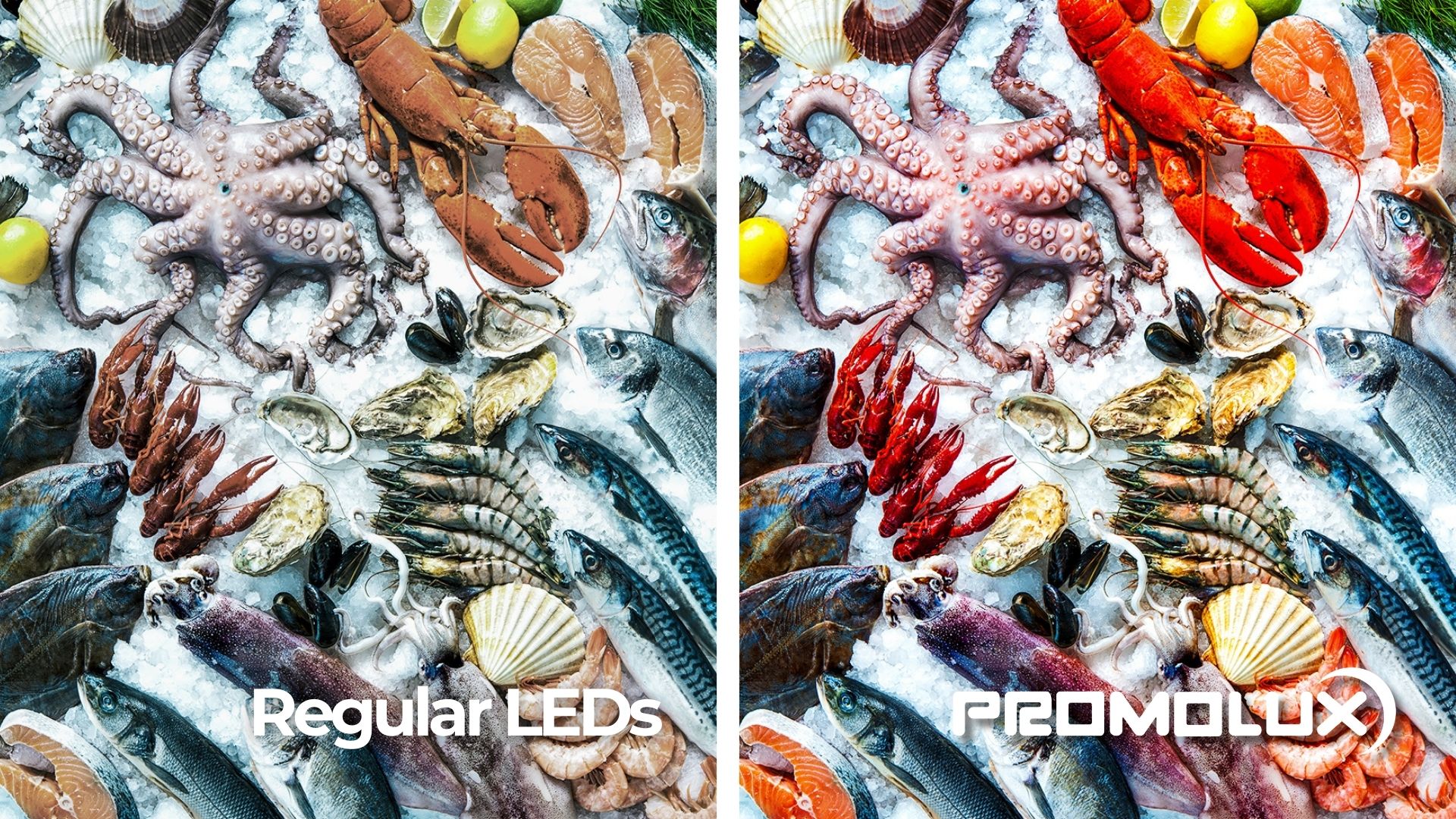 Meat appearance is governed by myoglobin chemistry; specific visible wavelengths drive conversion to brown metmyoglobin, while surface fats undergo light-driven reactions. Promolux’s meat pages describe why departments specify meat display lighting, fresh meat led display lighting, and led lighting for meat and deli refrigerated display cases to present true reds/whites without saturating counters in spectral regions linked to rapid discoloration. Their blogs and application notes state plainly that ordinary LEDs can accelerate photo and lipid oxidation leading to faster spoil, so food-specific spectrum matters for day-to-day merchandising and shopper confidence.